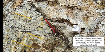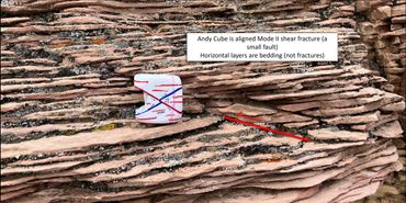 By understanding the relationships between fracture orientations and stress, a geoscientists can begin to predict the stresses (or paleo-stresses) that created observable fracture patterns. Or, vice versa, if stresses are known, then geoscientists can predict the expected fracture patterns that would result. Try placing your Andy Cube on an outcrop and align it with the fracture patterns you observe, can you predict the stress field at which they developed?